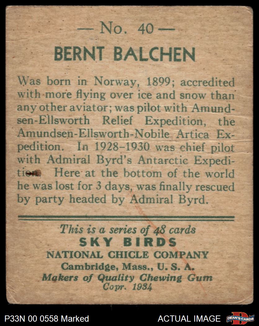 1934 National Chicle Sky Birds #40 Can read series of 48 or 144 cards on Back Bernt Balchen 1 - POOR