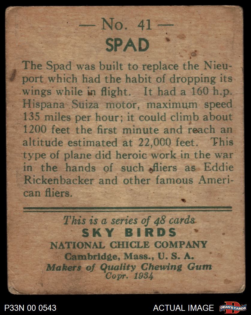 1934 National Chicle Sky Birds #41 Can read series of 48 or 144 cards on Back Spad 1.5 - FAIR