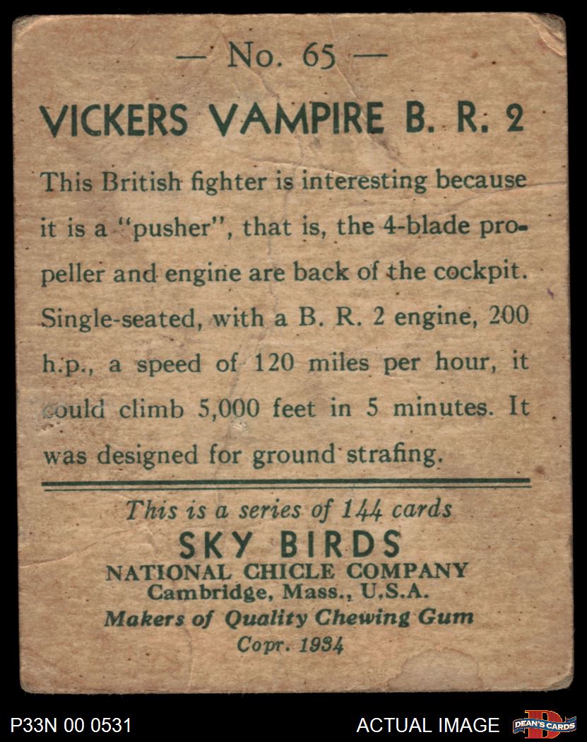 1934 National Chicle Sky Birds #65 Vickers Vampire BR2 1 - POOR
