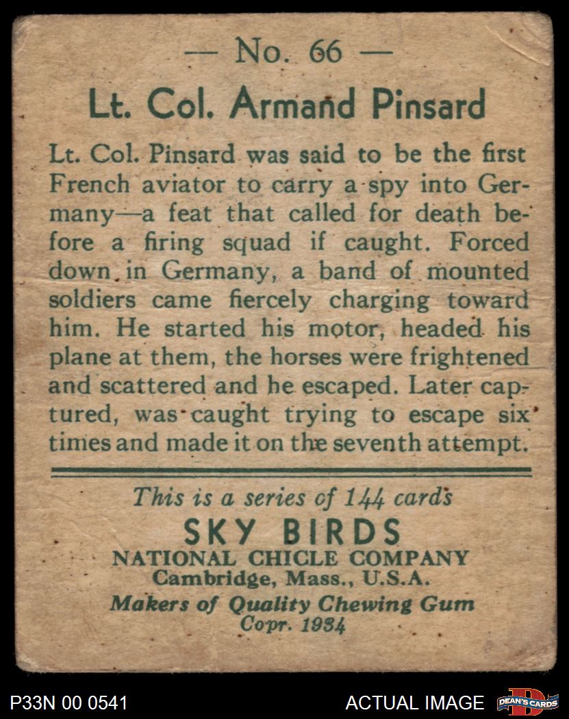 1934 National Chicle Sky Birds #66 Lt Col Pinsard 1.5 - FAIR