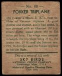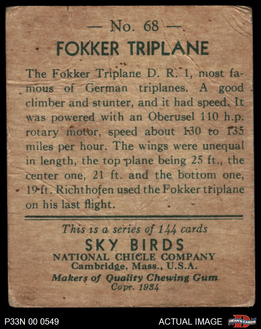 1934 National Chicle Sky Birds #68 Fokker Triplane 1 - POOR