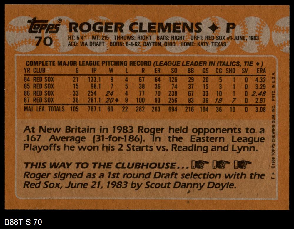 1988 Topps #70 Roger Clemens 8 - NM/MT