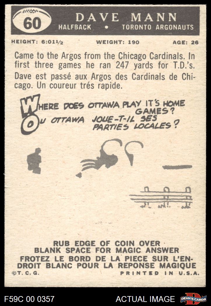 1959 Topps CFL #60 Dave Mann 8 - NM/MT