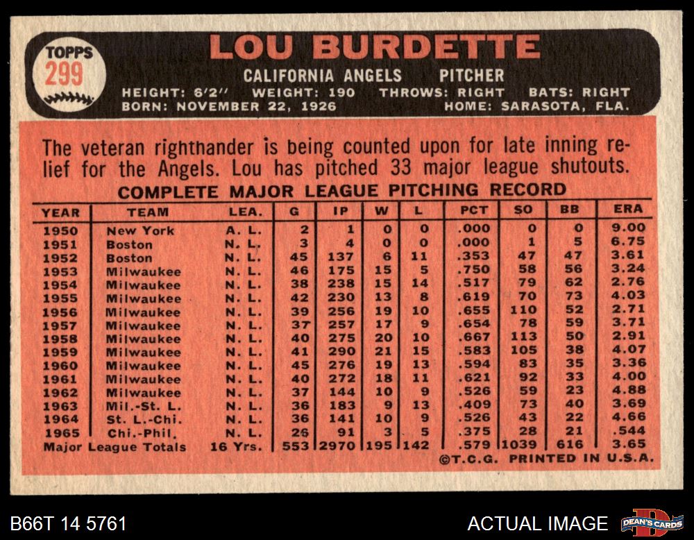 1966 Topps #299 Lew Burdette 6 - EX/MT