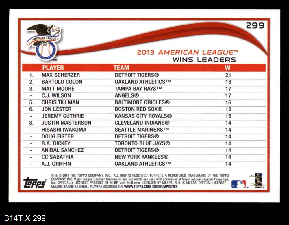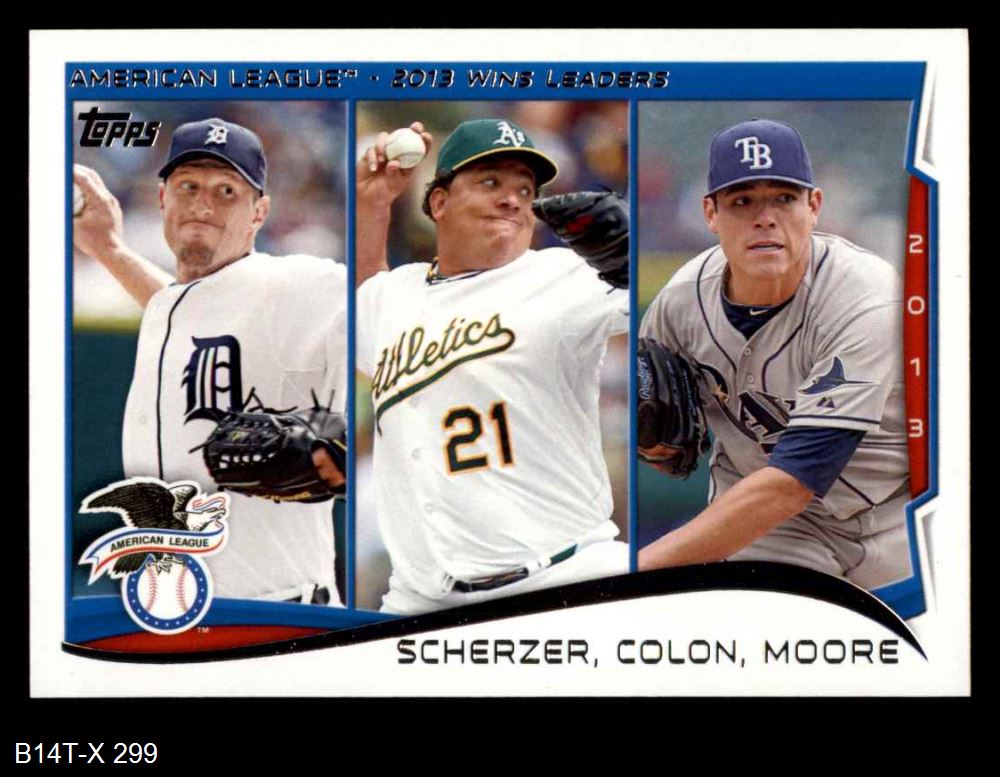 2014 Topps #299 - Max Scherzer / Bartolo Colon / Matt Moore AL Pitching Leaders 8 - NM/MT