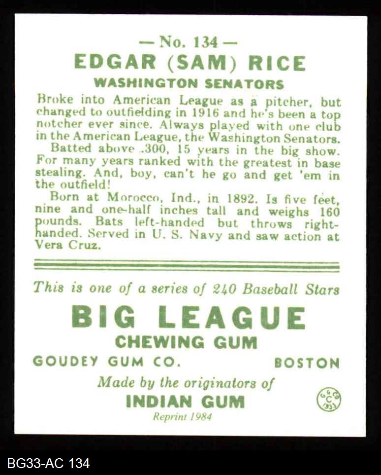 1933 Goudey Reprint #134 Sam Rice 8 - NM/MT