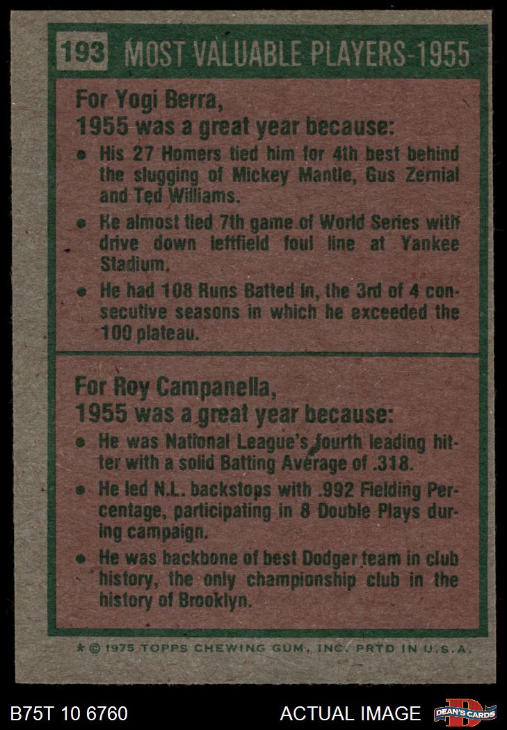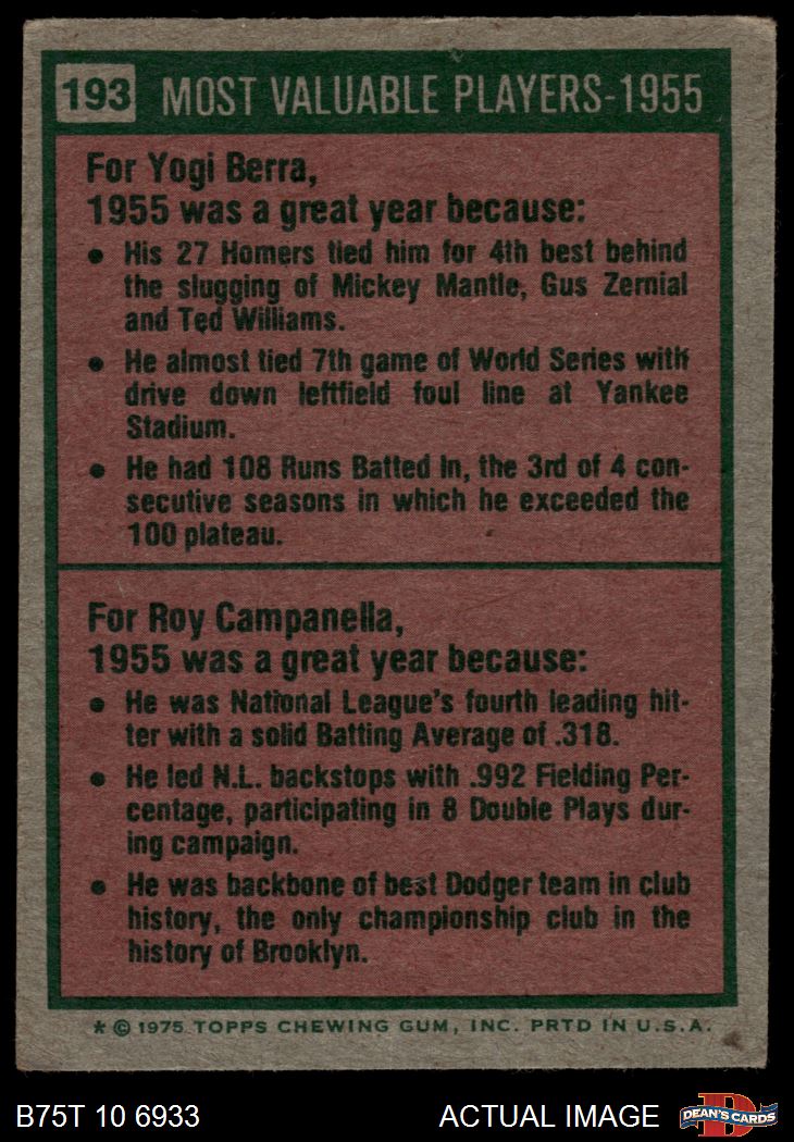 1975 Topps #193 - Yogi Berra / Roy Campanella 1955 MVPs 3 - VG