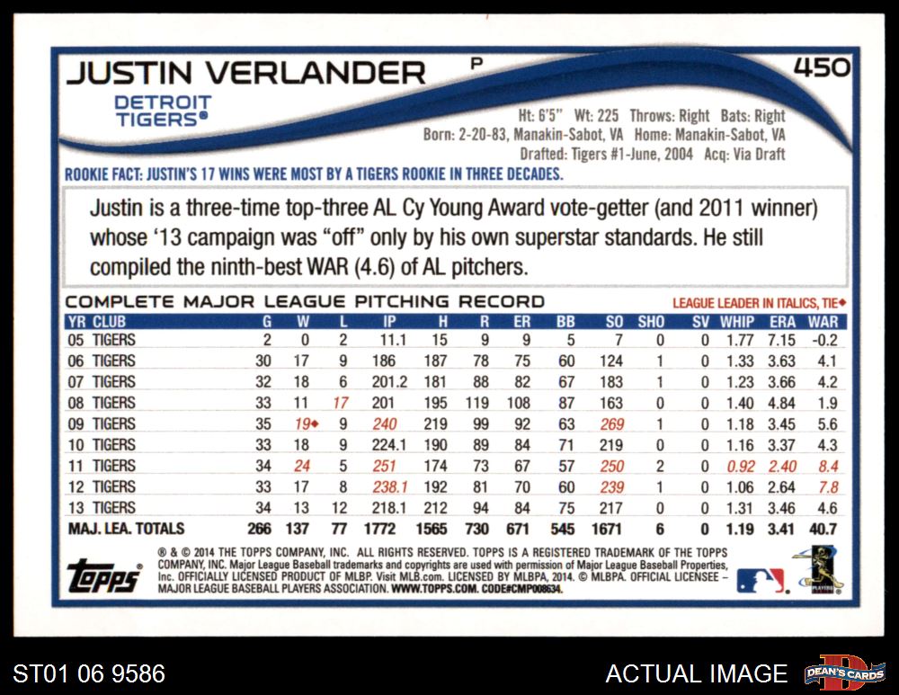 2014 Topps #450 Justin Verlander 8 - NM/MT