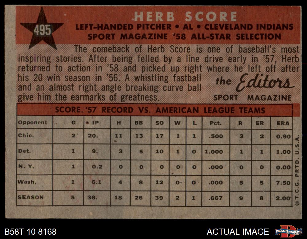 1958 Topps #495 - Herb Score All-Star 3 - VG