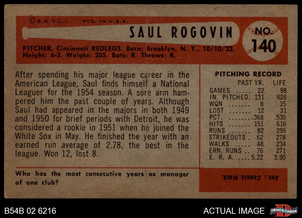 1954 Bowman #140 ERR Saul Rogovin 4 - VG/EX