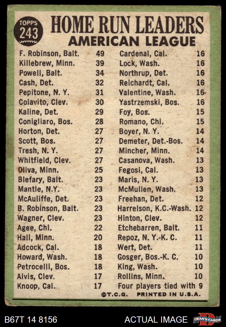 1967 Topps #243 - Harmon Killebrew / Boog Powell / Frank Robinson AL HR Leaders 1 - POOR