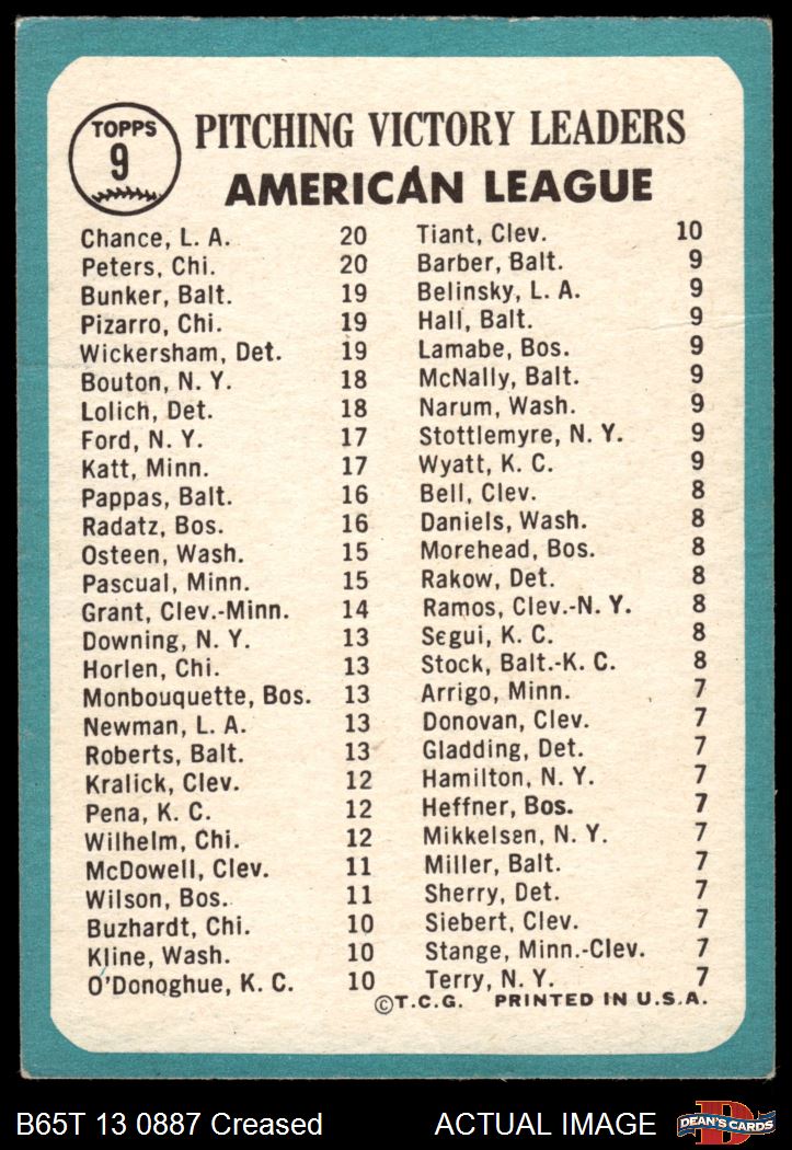 1965 Topps #9 - Wally Bunker / Dean Chance / Gary Peters / Juan Pizarro / Dave Wickersham AL Pitching Leaders 2.5 - GD+