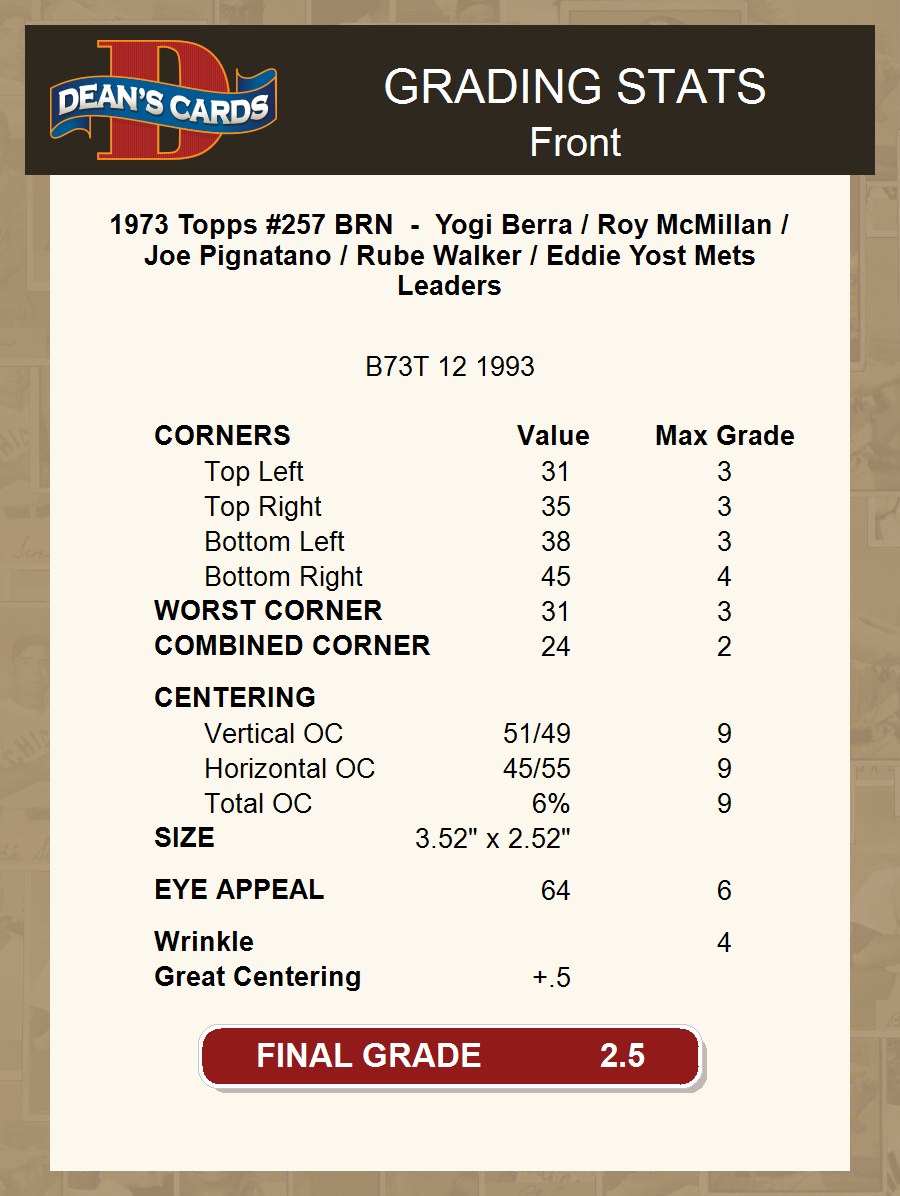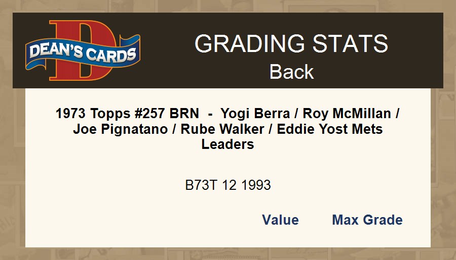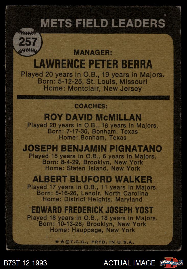 1973 Topps #257 BRN - Yogi Berra / Roy McMillan / Joe Pignatano / Rube Walker / Eddie Yost Mets Leaders 2.5 - GD+