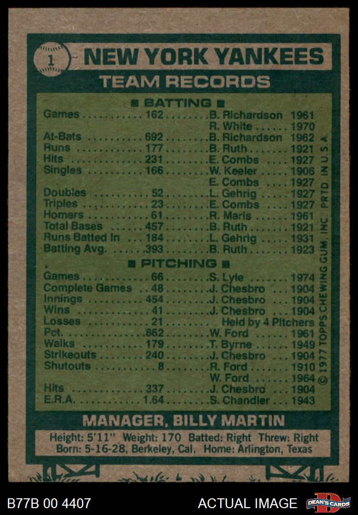 1977 Burger King #1 Yankees Team 3 - VG