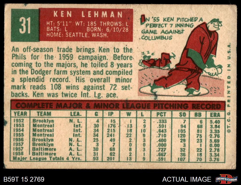 1959 Topps #31 Ken Lehman 1.5 - FAIR