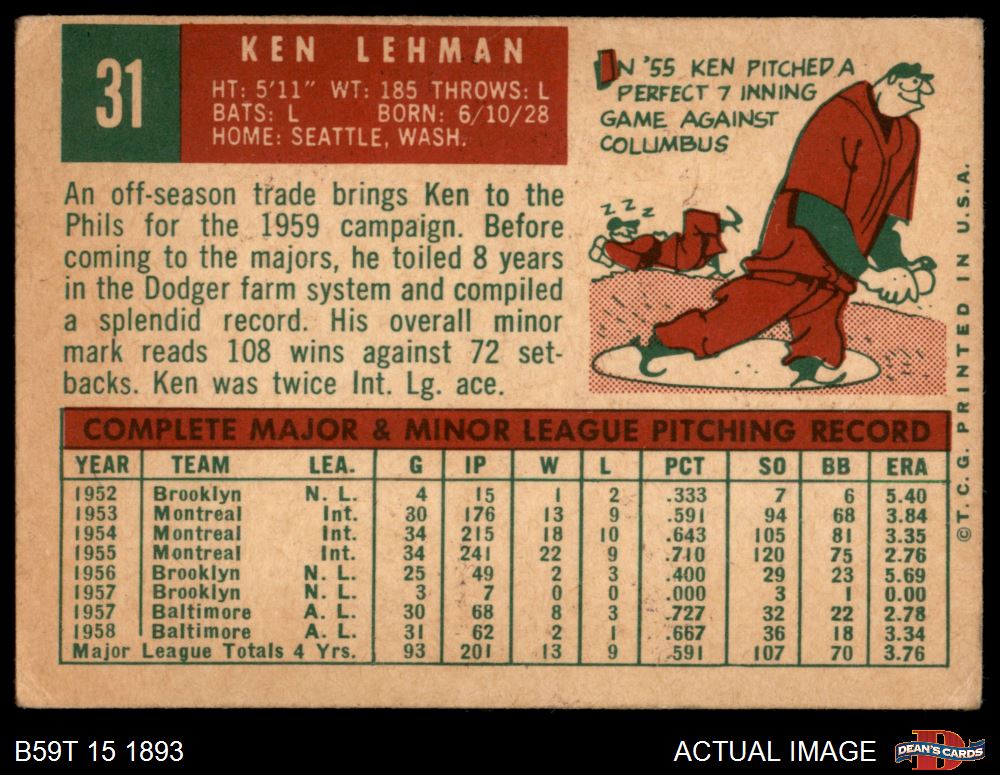 1959 Topps #31 Ken Lehman 3 - VG