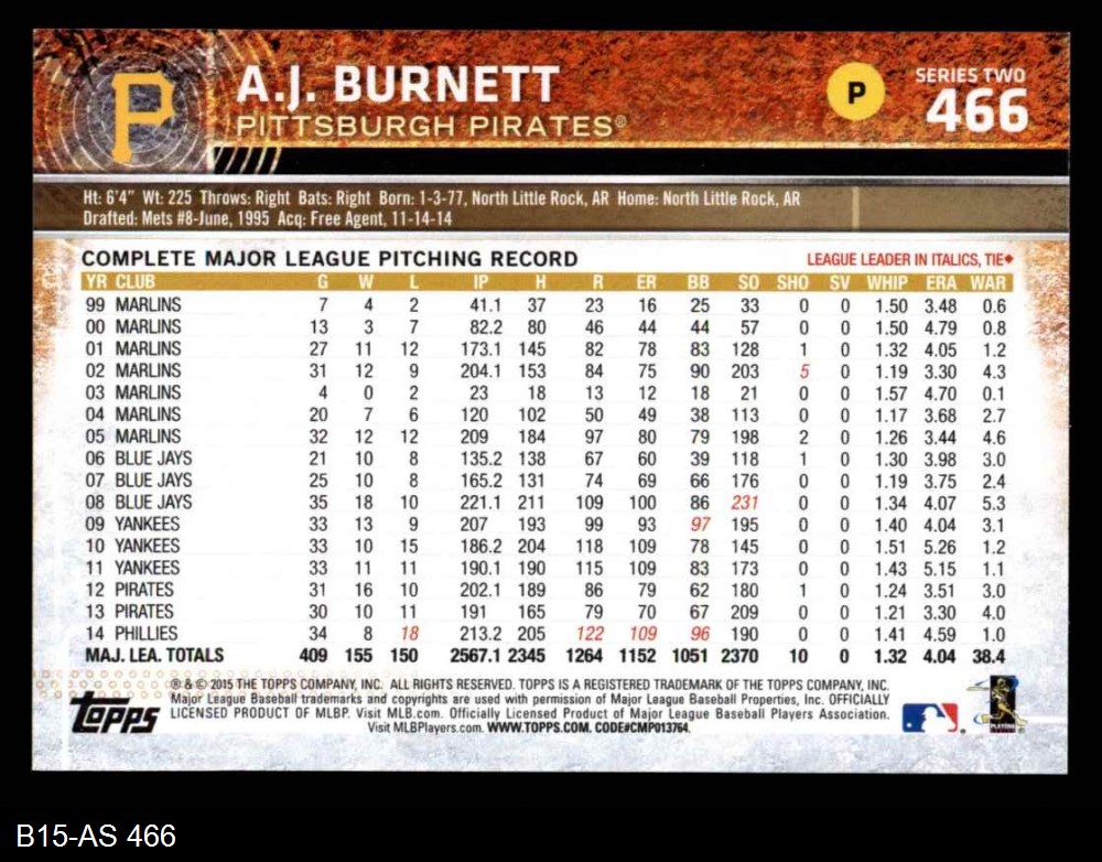 2015 Topps #466 A.J. Burnett