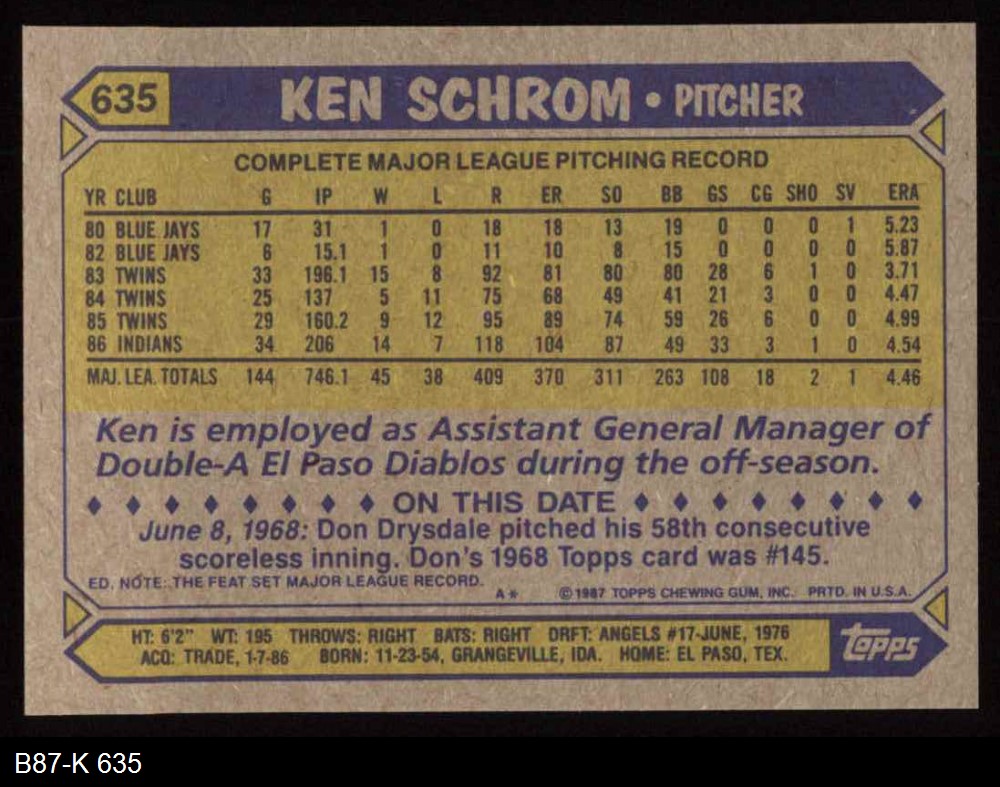 1987 Topps #635 Ken Schrom 8 - NM/MT