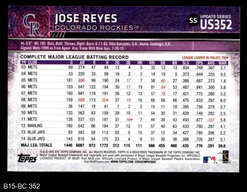 2015 Topps Update #352 Jose Reyes 8 - NM/MT