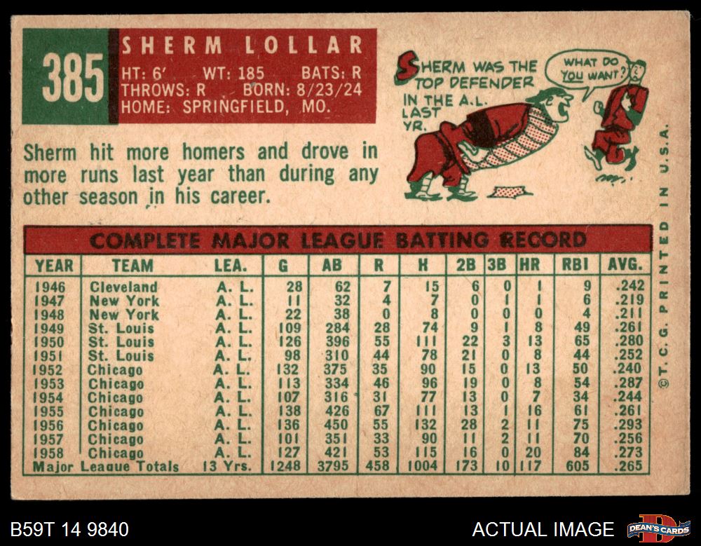 1959 Topps #385 Sherm Lollar 4 - VG/EX