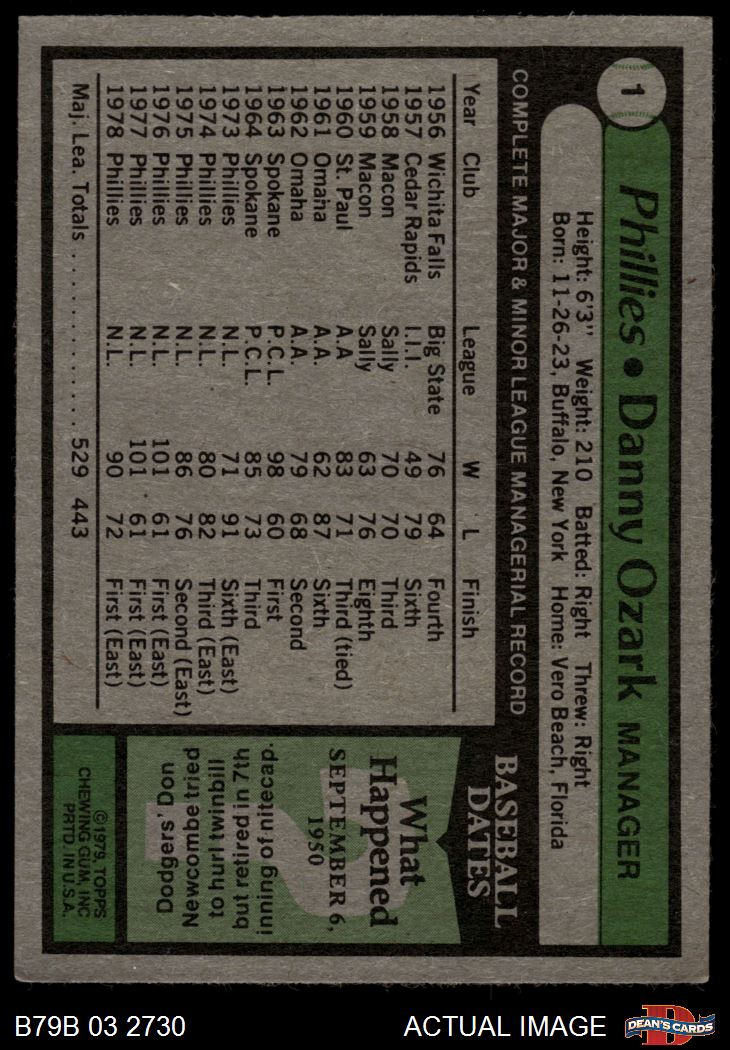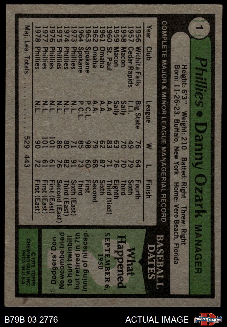 1979 Burger King Phillies #1 Danny Ozark 3 - VG