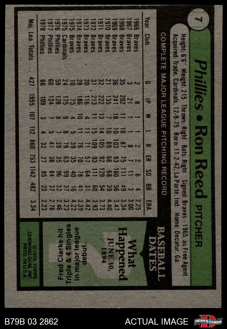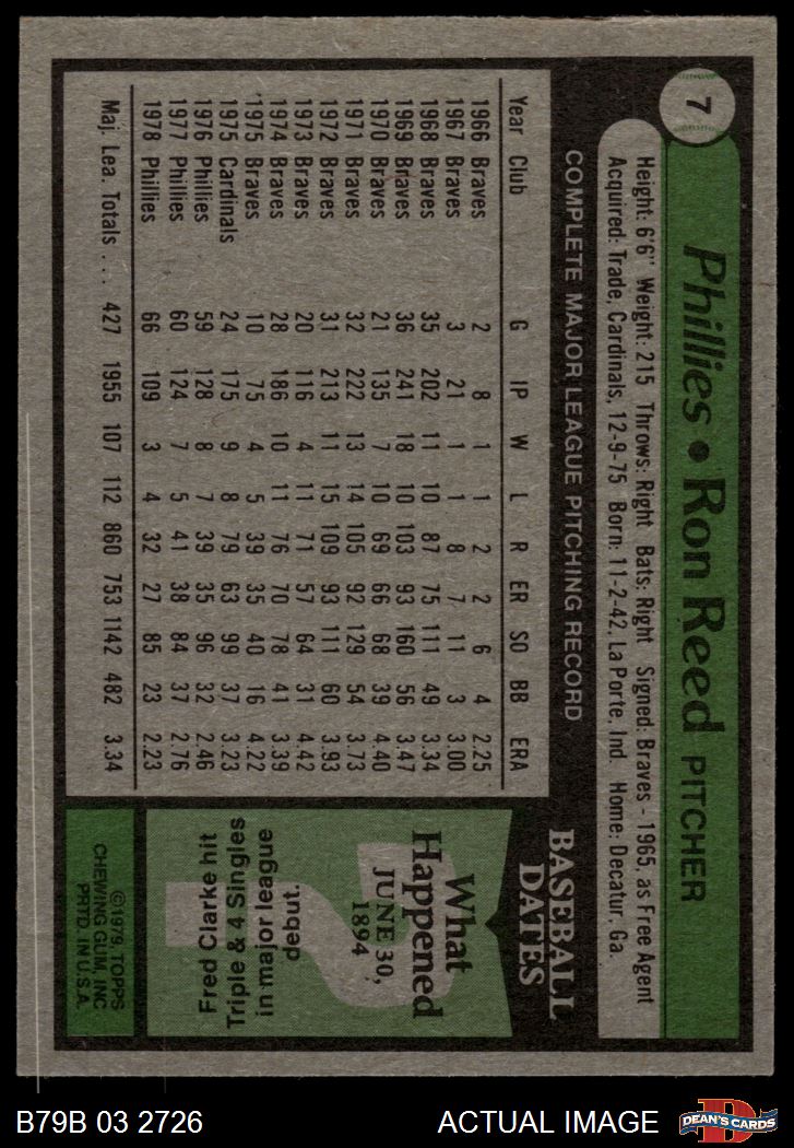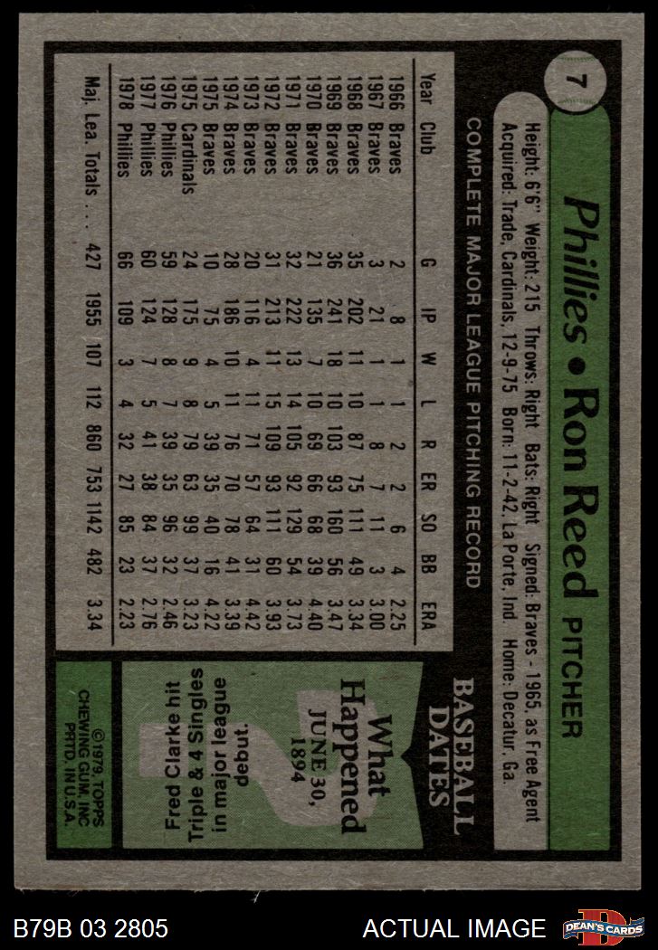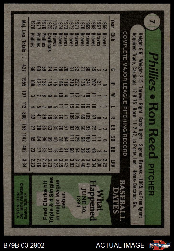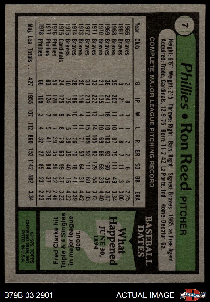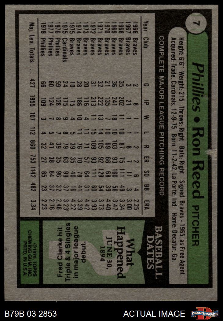 1979 Burger King Phillies #7 Ron Reed 2 - GOOD