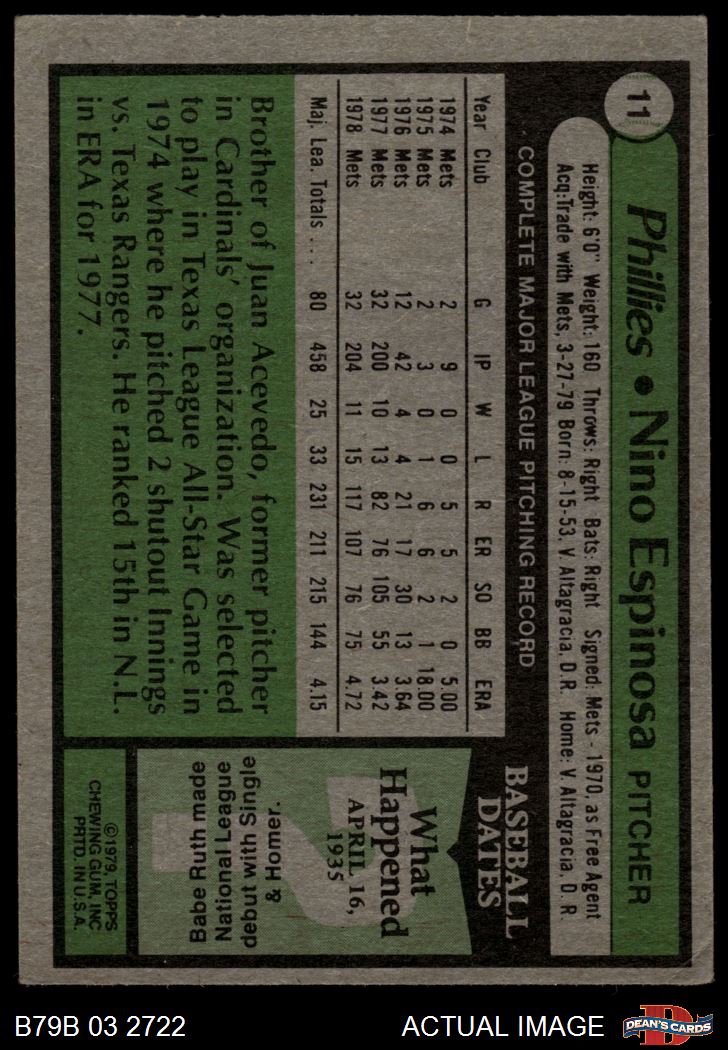 1979 Burger King Phillies #11 Nino Espinosa 2 - GOOD