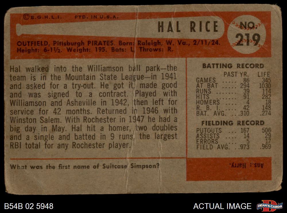 1954 Bowman #219 Hal Rice AUTHENTIC
