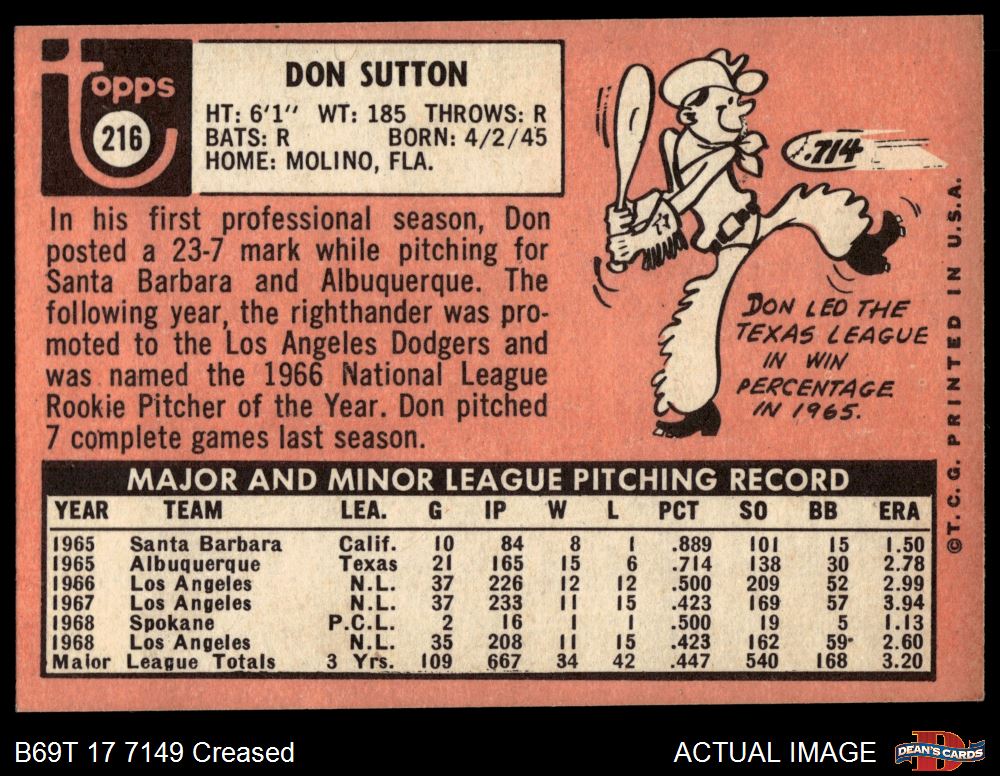 1969 Topps #216 Don Sutton 3 - VG