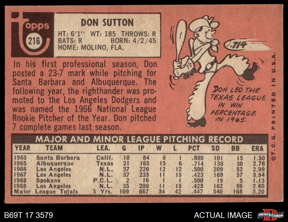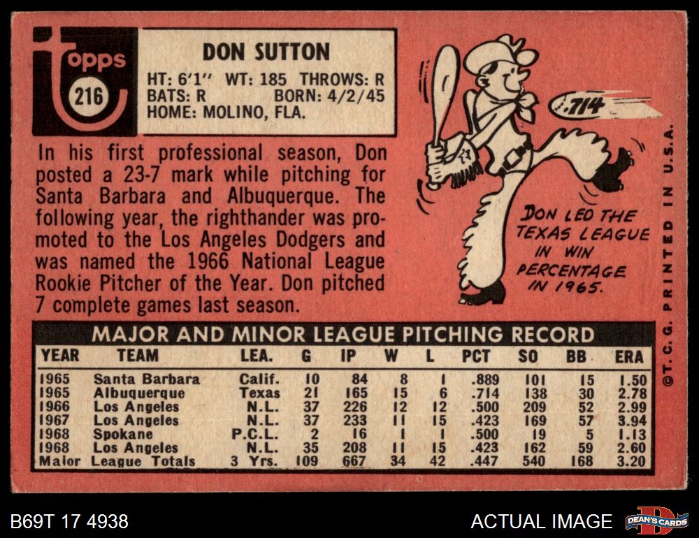 1969 Topps #216 Don Sutton 4 - VG/EX