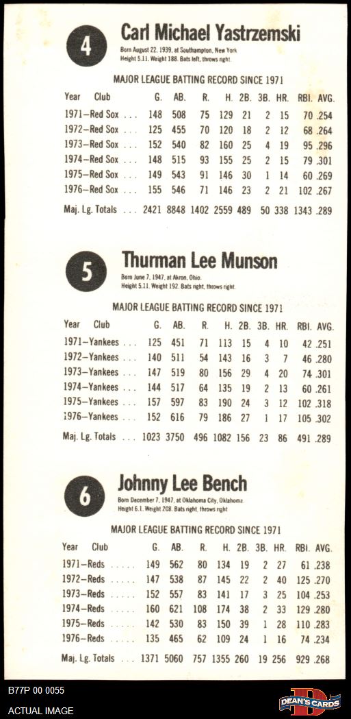 1977 Hostess Panels #4 #5 #6 Carl Yastrzemski / Thurman Munson / Johnny Bench 6 - EX/MT