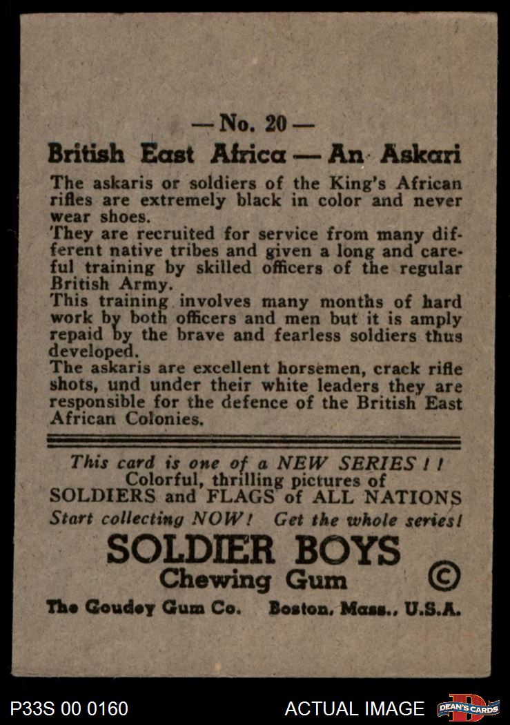 1933 Goudey Soldier Boys #20 British East Africa - An Askari 3 - VG