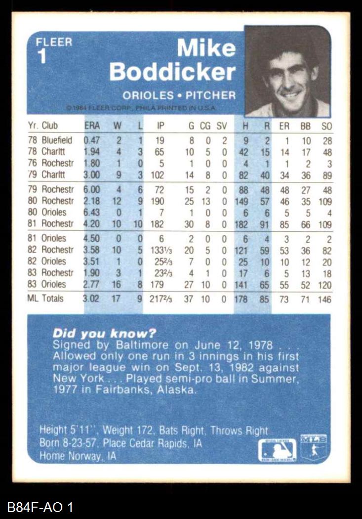 1984 Fleer #1 Mike Boddicker 8 - NM/MT