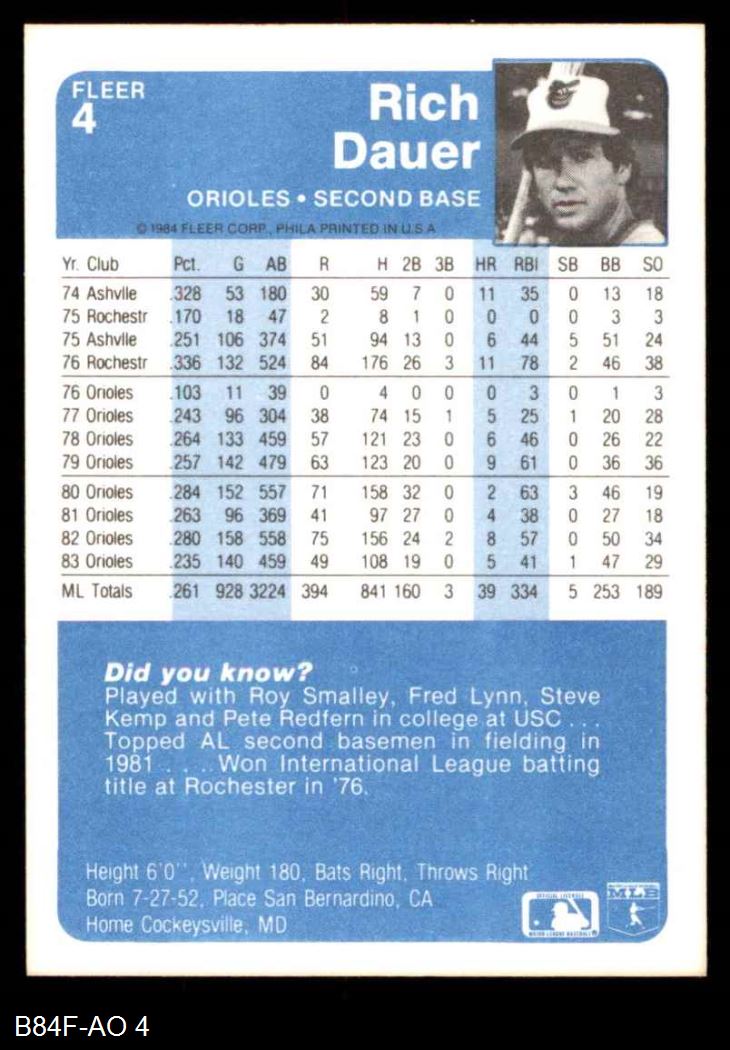 1984 Fleer #4 Rich Dauer 8 - NM/MT