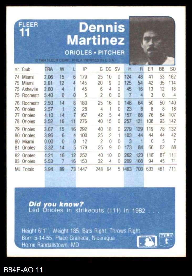 1984 Fleer #11 Dennis Martinez 8 - NM/MT