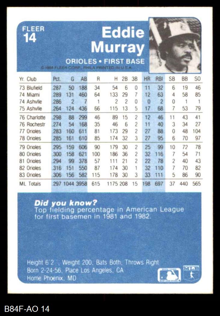 1984 Fleer #14 Eddie Murray 8 - NM/MT