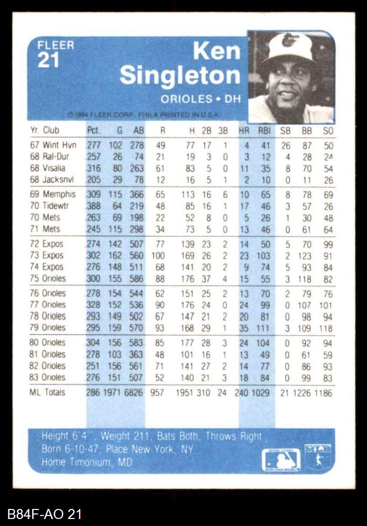 1984 Fleer #21 Ken Singleton 8 - NM/MT
