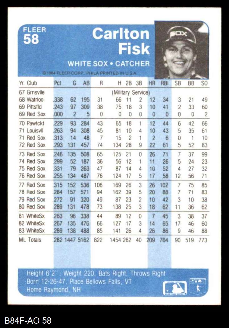 1984 Fleer #58 Carlton Fisk 8 - NM/MT