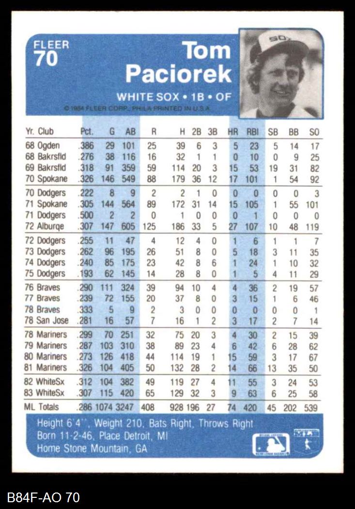 1984 Fleer #70 Tom Paciorek