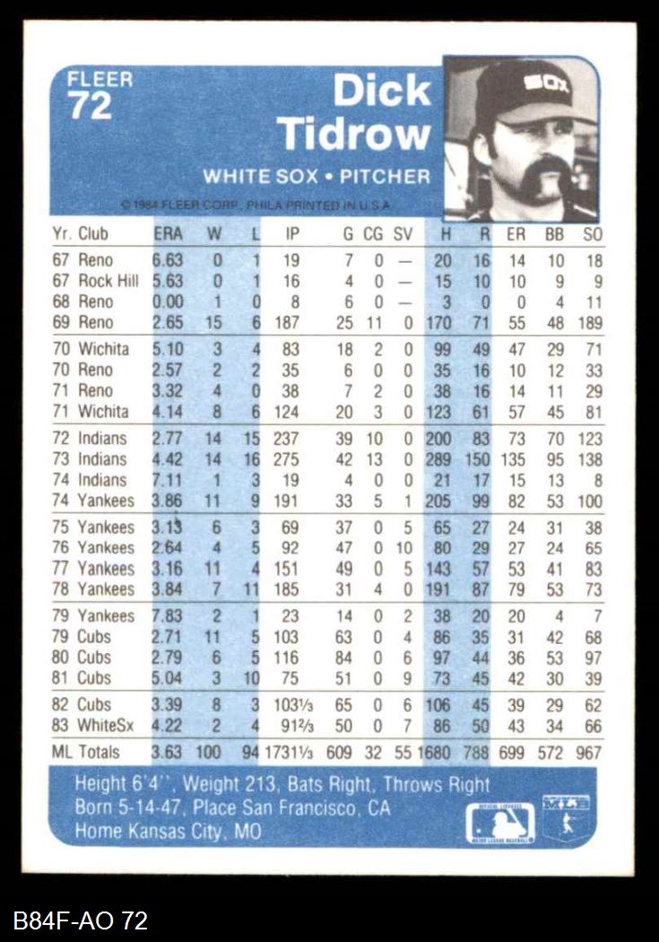 1984 Fleer #72 Dick Tidrow 8 - NM/MT