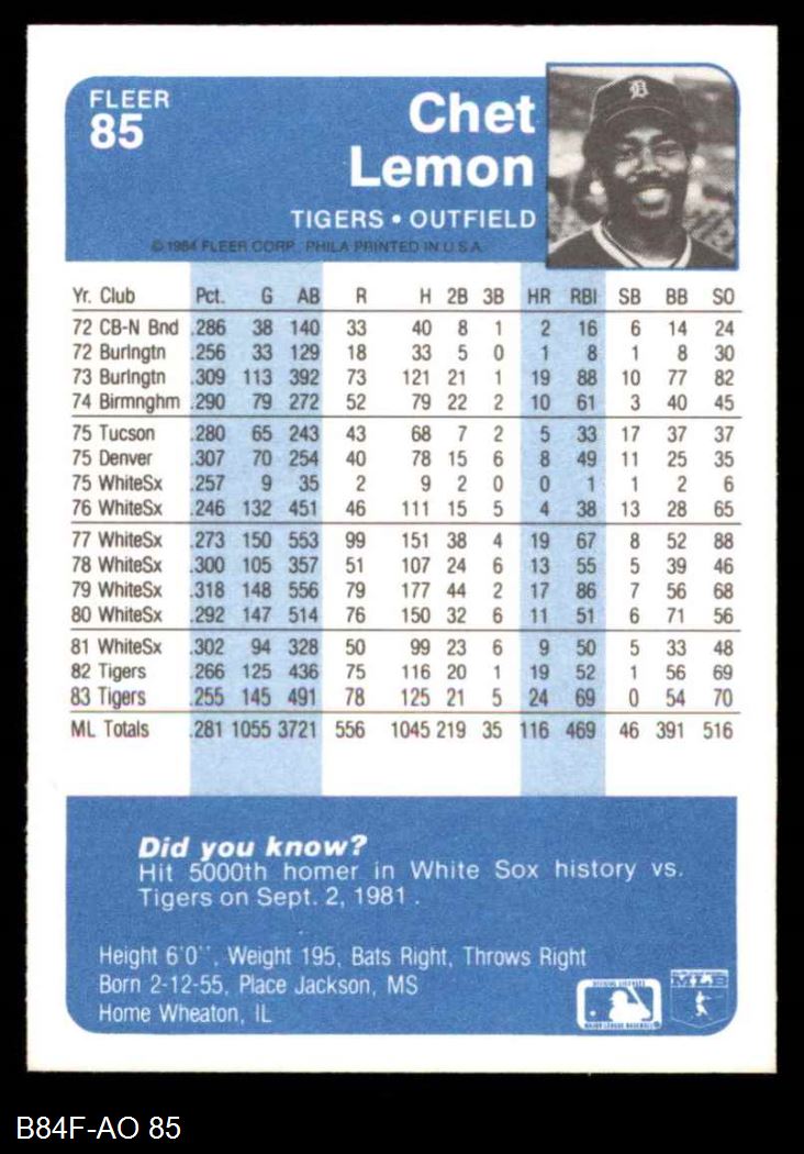 1984 Fleer #85 Chet Lemon 8 - NM/MT