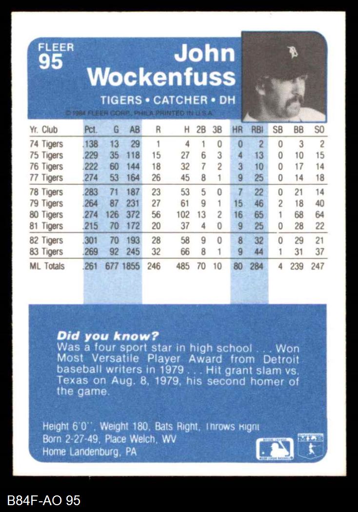 1984 Fleer #95 John Wockenfuss 8 - NM/MT