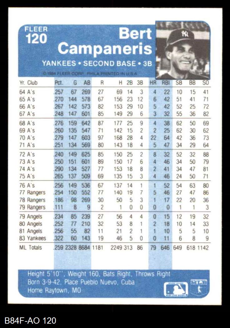 1984 Fleer #120 Bert Campaneris 8 - NM/MT