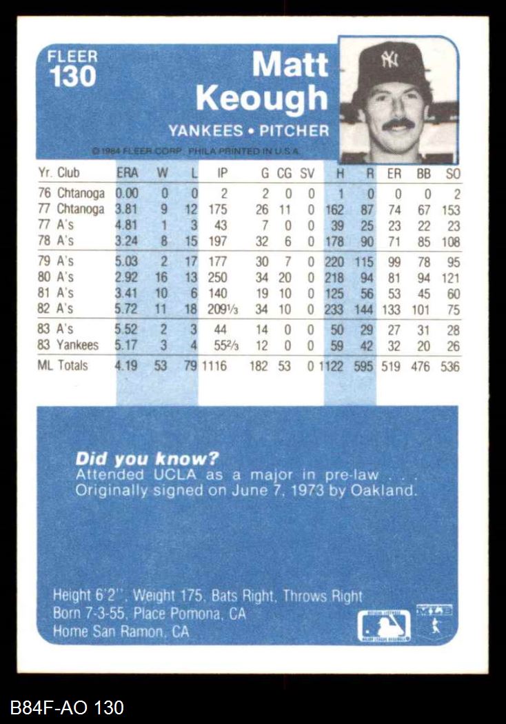 1984 Fleer #130 Matt Keough 8 - NM/MT
