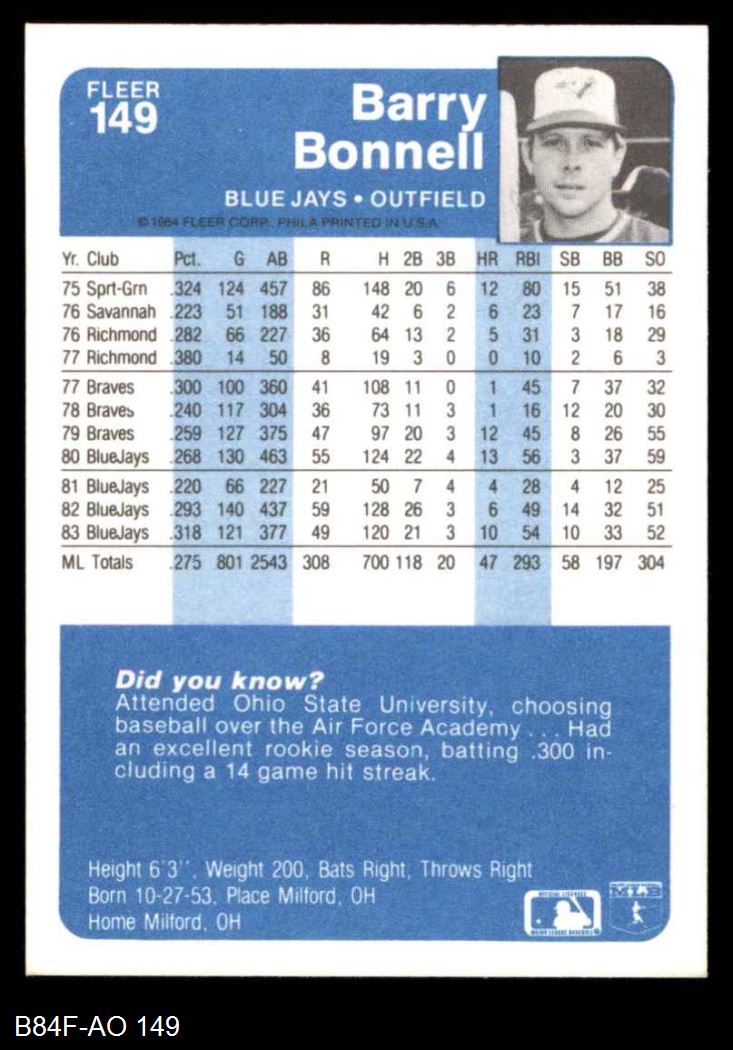 1984 Fleer #149 Barry Bonnell