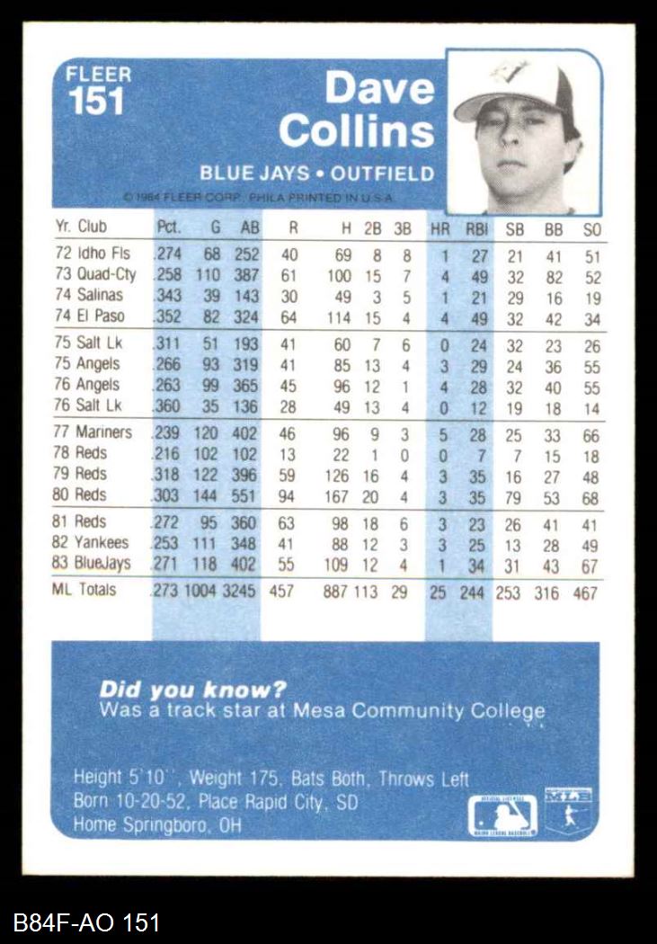 1984 Fleer #151 Dave Collins 8 - NM/MT