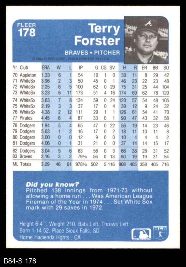 1984 Fleer #178 Terry Forster 8 - NM/MT
