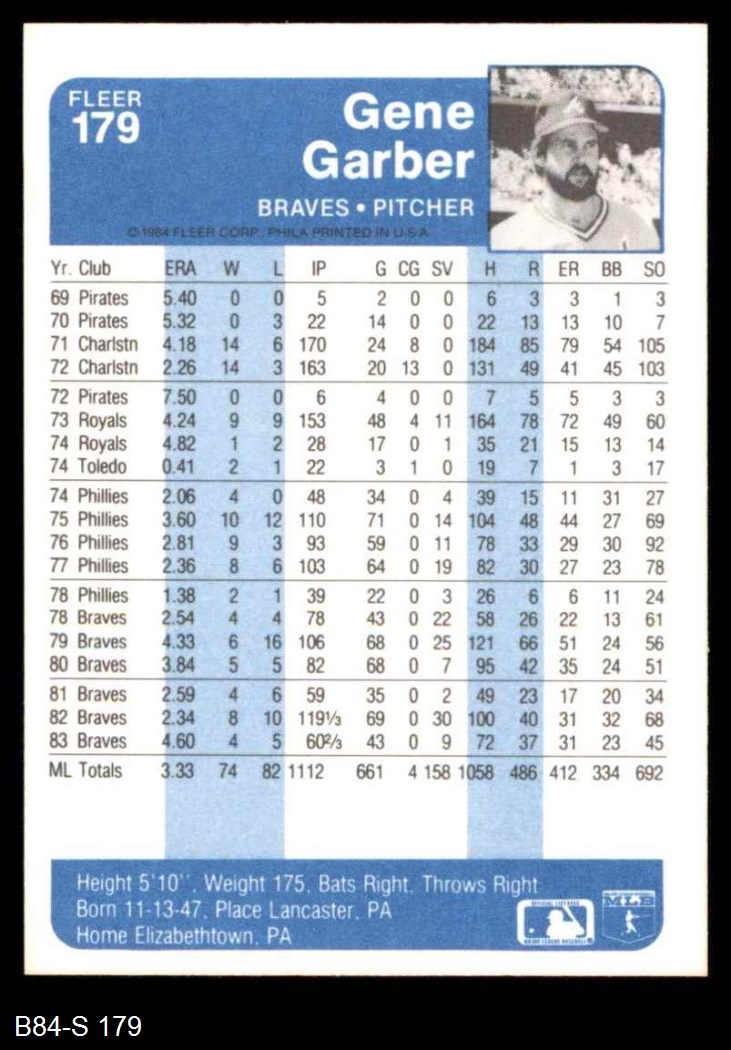 1984 Fleer #179 Gene Garber 8 - NM/MT