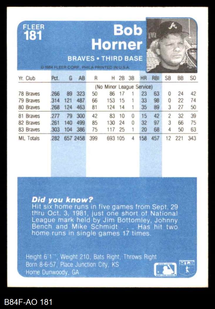1984 Fleer #181 Bob Horner