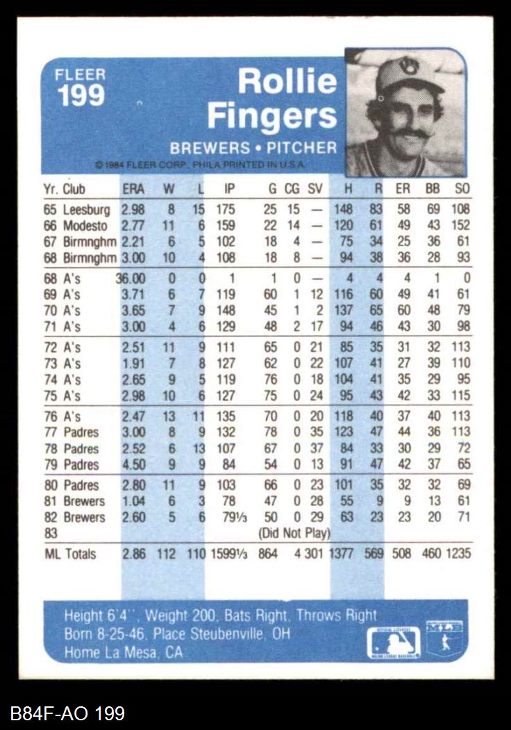 1984 Fleer #199 Rollie Fingers 8 - NM/MT